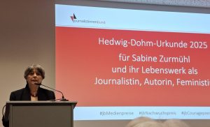 Laudatio und Dankesrede siehe: https://www.journalistinnen.de/verleihung-der-jb-medienpreise-2025/